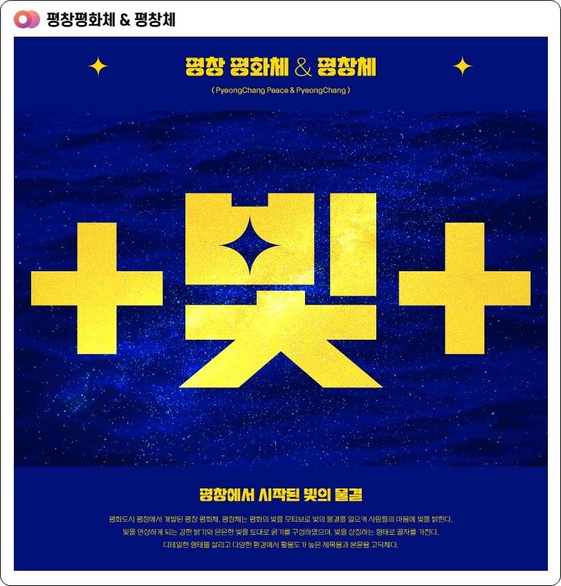 이번 글은 평창군서체중 가장 인기가 많은 평창평화체를 공유하였습니다. 빛과 관련된 포스터에 활용해 보시기를 조심스럽게 권해봅니다. 사용하고자 하시는 분은 상단의 링크를 통해 평창군 사이트에서 다운로드 하시기 바랍니다.
