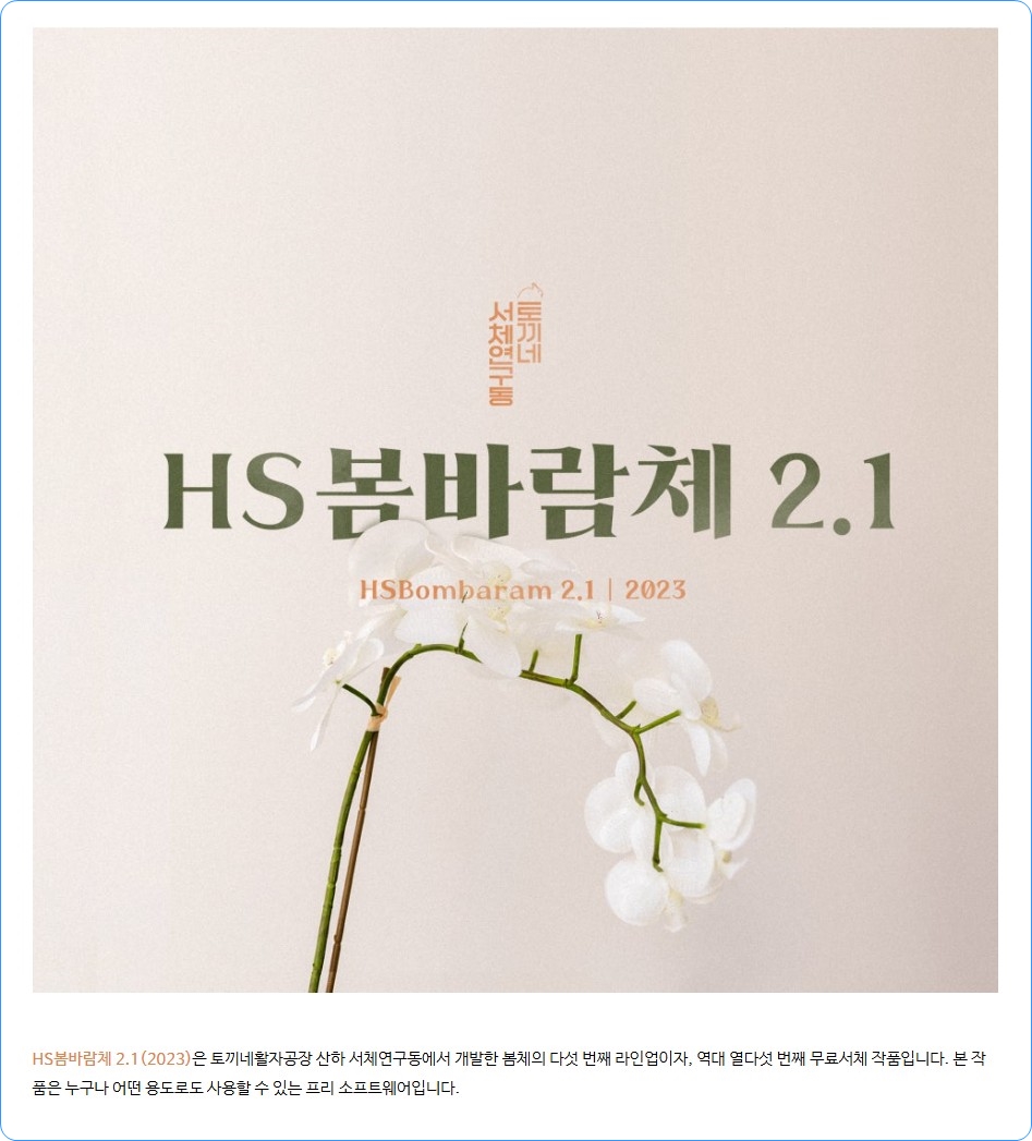 이번 글은 유이주의적달필가 블로그의 풀빛님이 무료로 배포하고 있는 HS 봄바람체 2.1을 공유해 보았습니다. 사용하고자 하는 분은 상단의 첨부파일을 다운하시기 바랍니다.