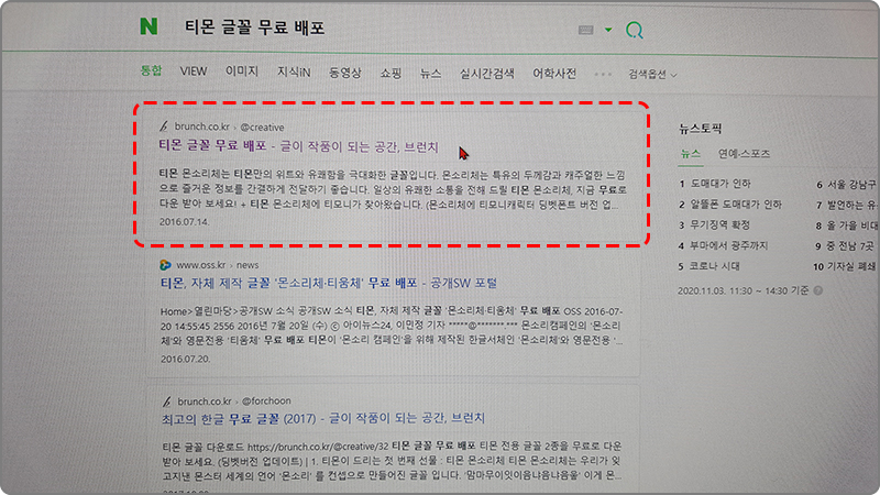 - 검색 포털에서 ' 티몬 글꼴 무료 배포' 검색 > brunch 홈페이지 접속 > '폰트 패키지 전체 다운로드' 선택