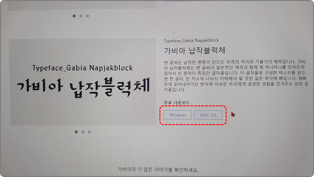 - 검색 포털에서 '가비아 폰트' 검색 > 홈페이지 하단으로 이동 > 납작블럭체 무료다운로드 중 운영체제에 따라 취사선택